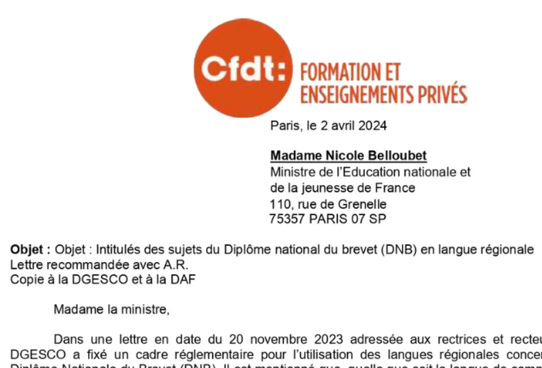 La Fep-CFDT demande à la ministre qu’une uniformité soit réalisée concernant les épreuves du DNB en langue régionale, calquée sur le mieux disant, à savoir :