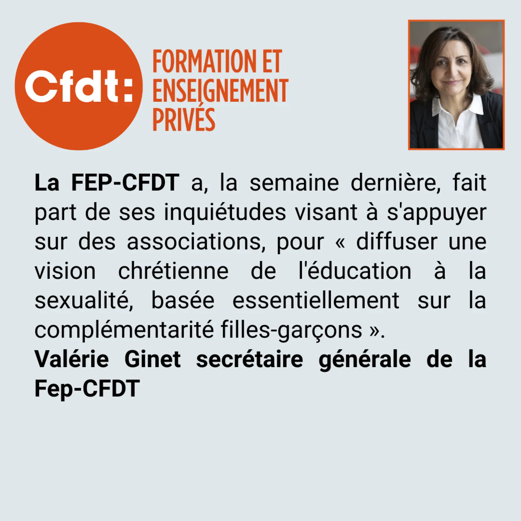 Le nouveau secrétaire général de l'enseignement catholique, Guillaume Prévost, revendique un discours destiné à rallier des familles qui se tournent vers les écoles hors contrat. La FEP-CFDT a, la semaine dernière, fait part de ses inquiétudes visant à s'appuyer sur des associations, pour « diffuser une vision chrétienne de l'éducation à la sexualité, basée essentiellement sur la complémentarité filles-garçons ».