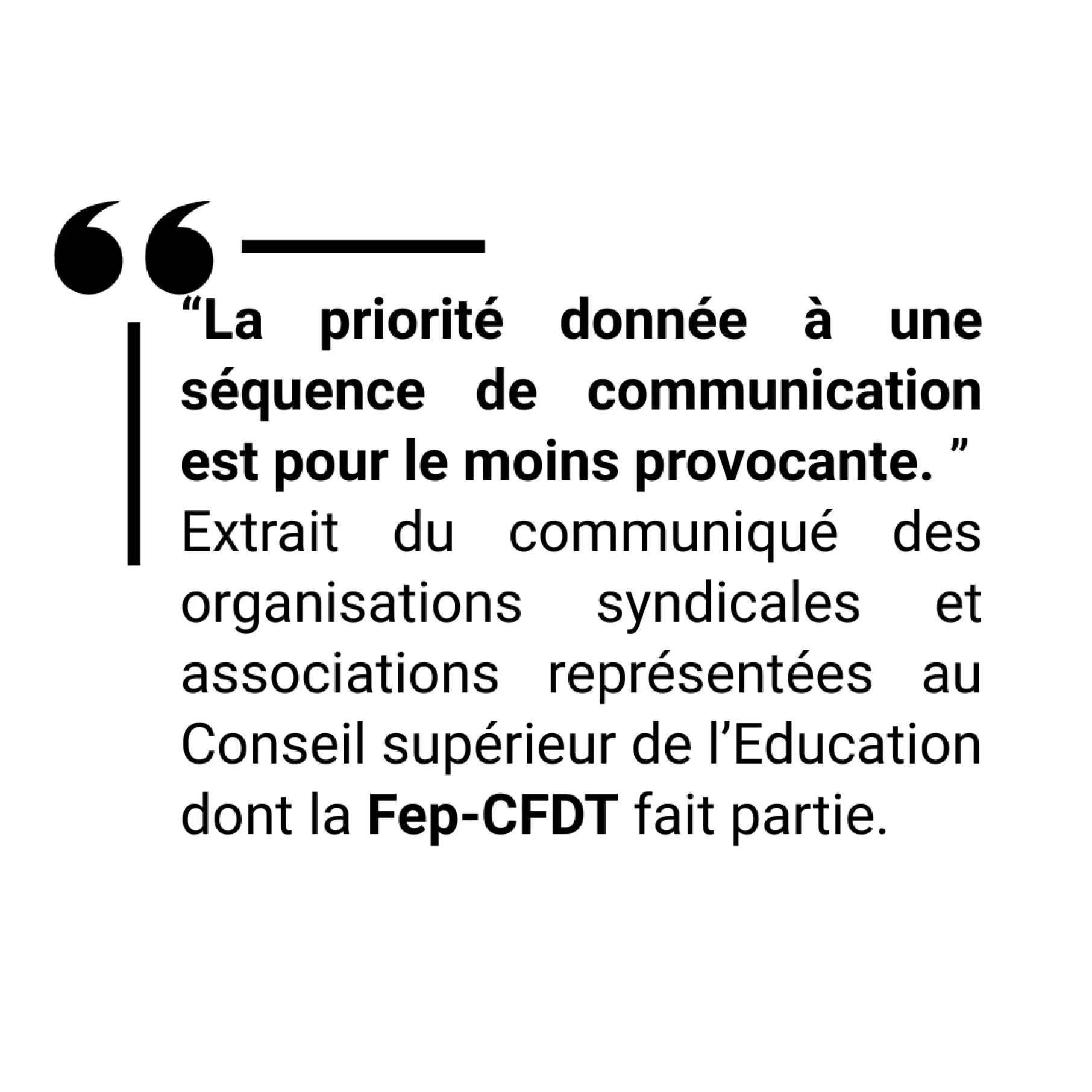 « Le ministre privilégie un déplacement pour présenter devant « un panel d’enseignants et de personnels de direction » les résultats des évaluations nationales standardisées. La priorité donnée à une séquence de communication est pour le moins provocante. Le ministre préfère choisir ses interlocuteurs en les triant sur le volet, au lieu d’engager le débat avec les représentant·es des personnels, des parents, des lycéen·nes et étudiant·es présent·es au CSE » (Extrait du communiqué de presse cité par le café pédagogique)