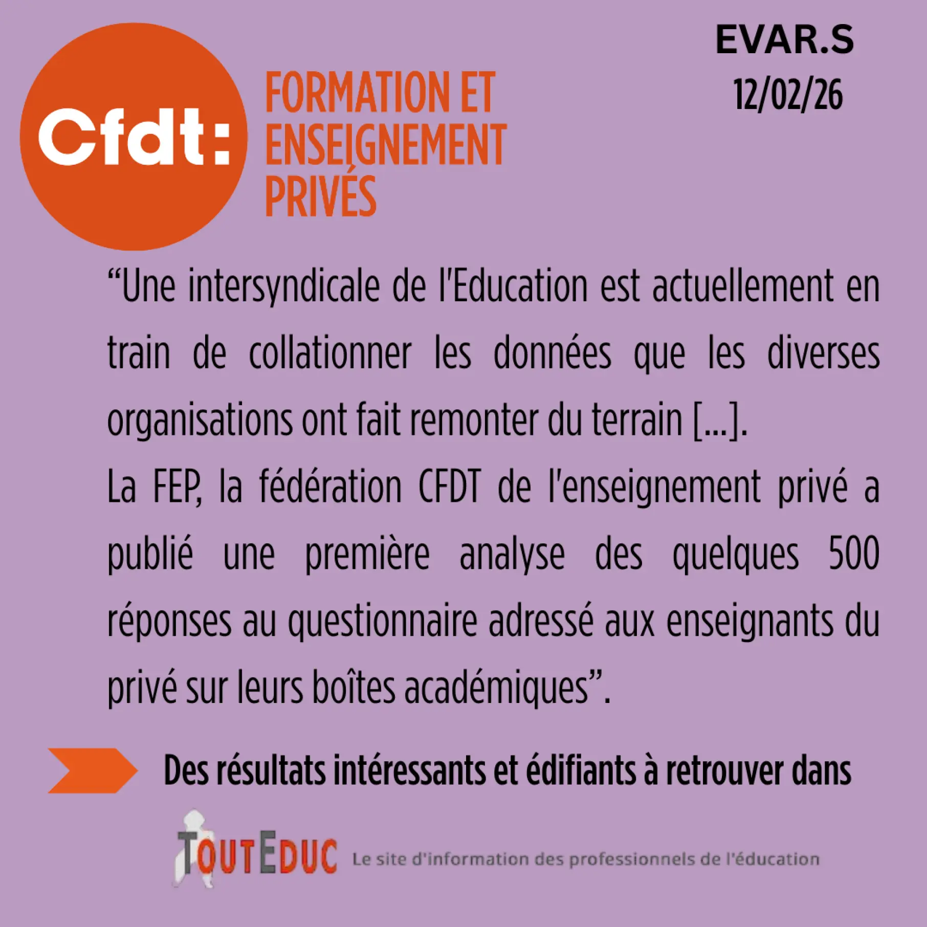 2026-02-12 - TOUT EDUC - EVARS et enseignement privé : la FEP-CFDT dénonce des dérives