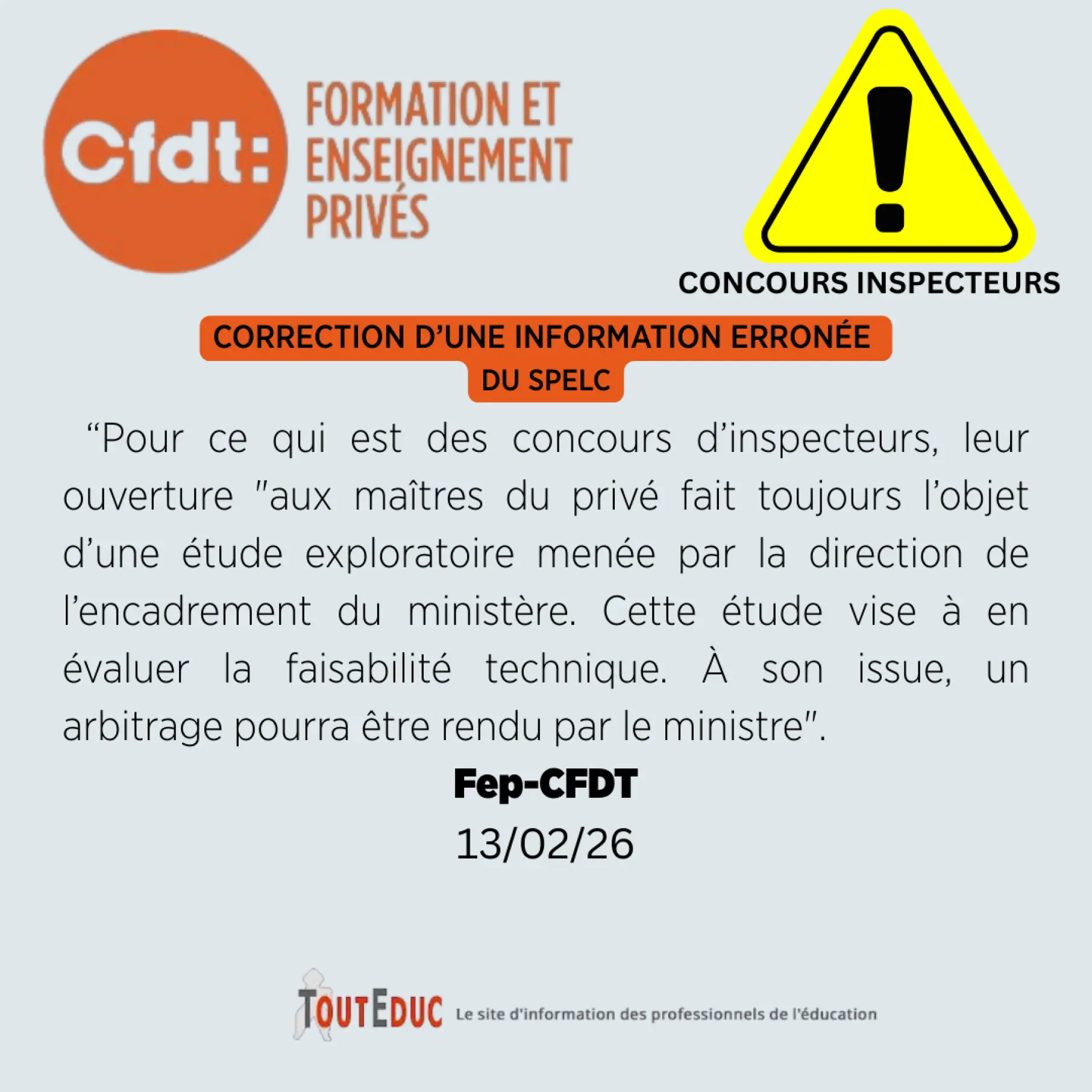 2026-02-13 - TOUT EDUC - Des enseignants du privé pourraient accéder aux concours d'inspecteurs (rectification de la Fep-CFDT suite à une information erronée du SPELC)