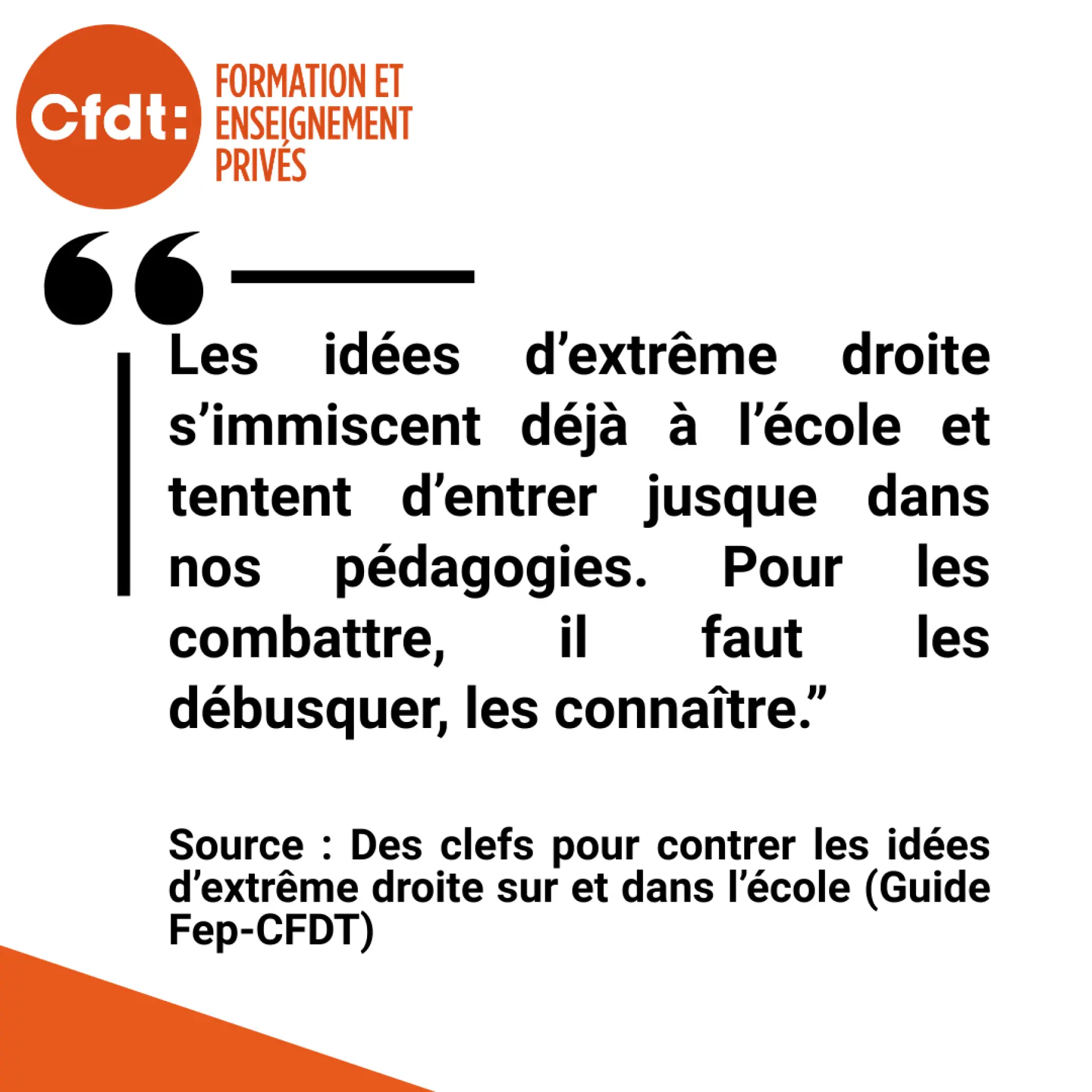 La Fep-CFDT publie un guide pour contrer les idées d’extrême droite à l’école. L’organisation rappelle que l’École est un pilier essentiel de la démocratie. Elle insiste sur son rôle pour former des citoyens libres, critiques et éclairés.« Face à l’extrême droite, il ne suffit pas d’être contre. Il faut comprendre, nommer, démonter et construire », peut-on lire dans le guide de 22 pages.