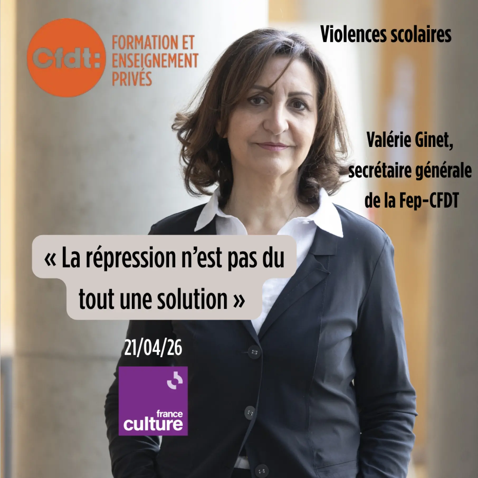 2026-04-21 - FRANCE CULTURE - Journal de 8h - Valérie Ginet, notre secrétaire générale de la Fep-CFDT interviewée sur les violences scolaires à l'occasion de l'ouverture du procès du mineur ayant assassiné Agnès Lasalle