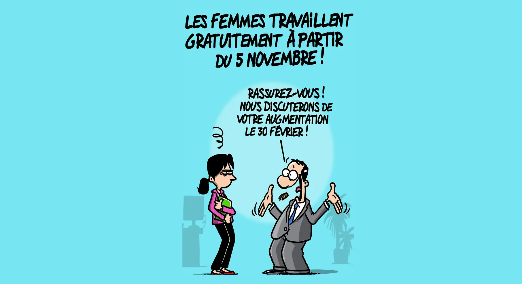 En 2019 encore, malgré les progrès législatifs, les inégalités des salaires entre les femmes et les hommes restent à hauteur de 24 % (17 % en équivalent temps plein.) En conséquence, si nous comparons ces salaires sur l’année 2019, les femmes ne seraient plus payées à partir du 5 novembre à 16 h 47 !