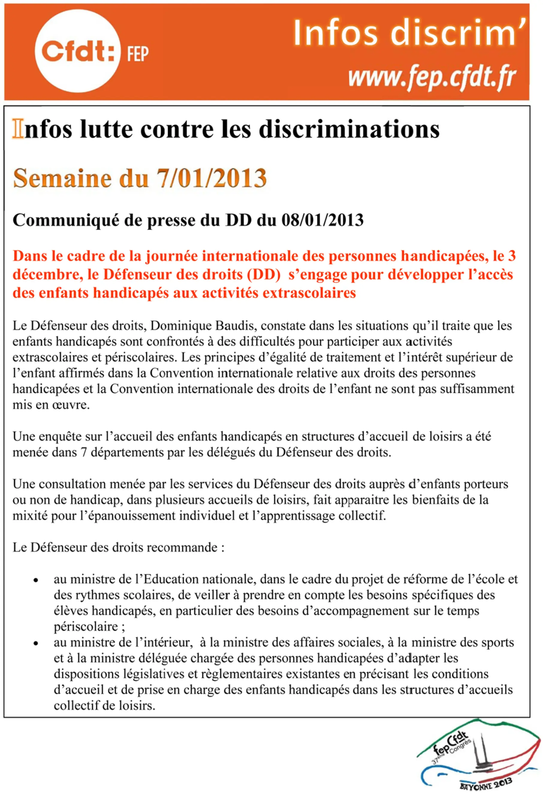 Le Défenseur des droits, Dominique Baudis, constate dans les situations qu’il traite que les enfants handicapés sont confrontés à des difficultés pour participer aux activités extrascolaires et périscolaires. Les principes d’égalité de traitement et l’intérêt supérieur de l’enfant affirmés dans la Convention internationale relative aux droits des personnes handicapées et la Convention internationale des droits de l’enfant ne sont pas suffisamment mis en œuvre