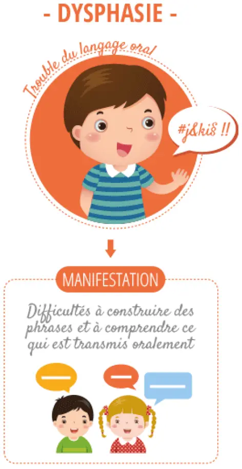 La dysphasie peut se manifester soit en émission, c’est-à-dire que l’élève sera incompréhensible ou utilisera régulièrement des mots à la place d’autres, soit en réception, c’est-à-dire qu’il ne comprendra pas certains mots, soit les deux associés.
