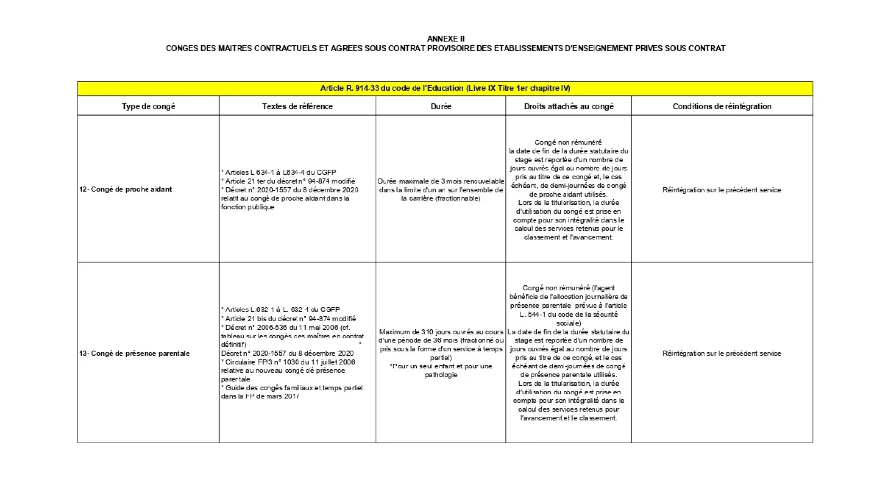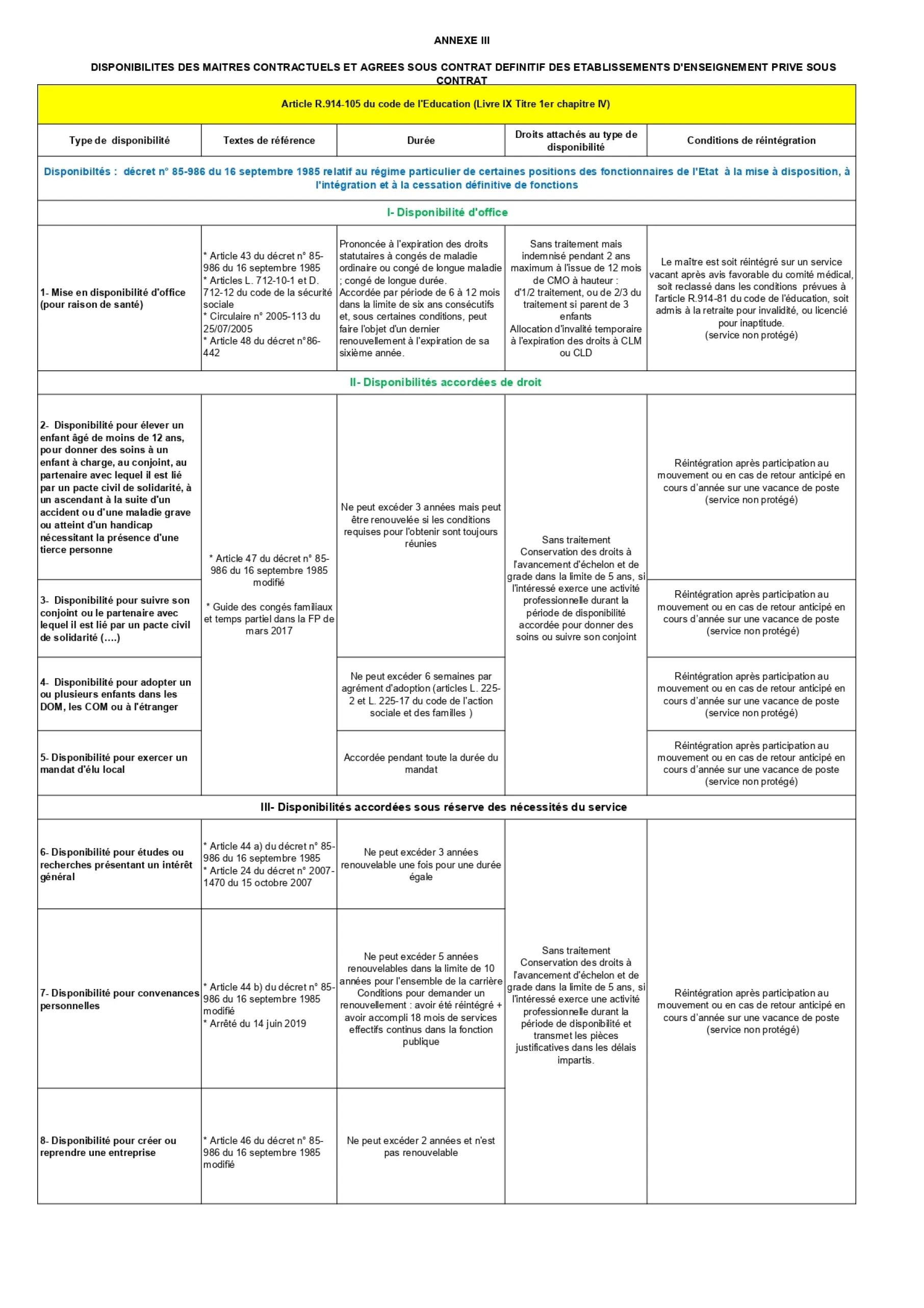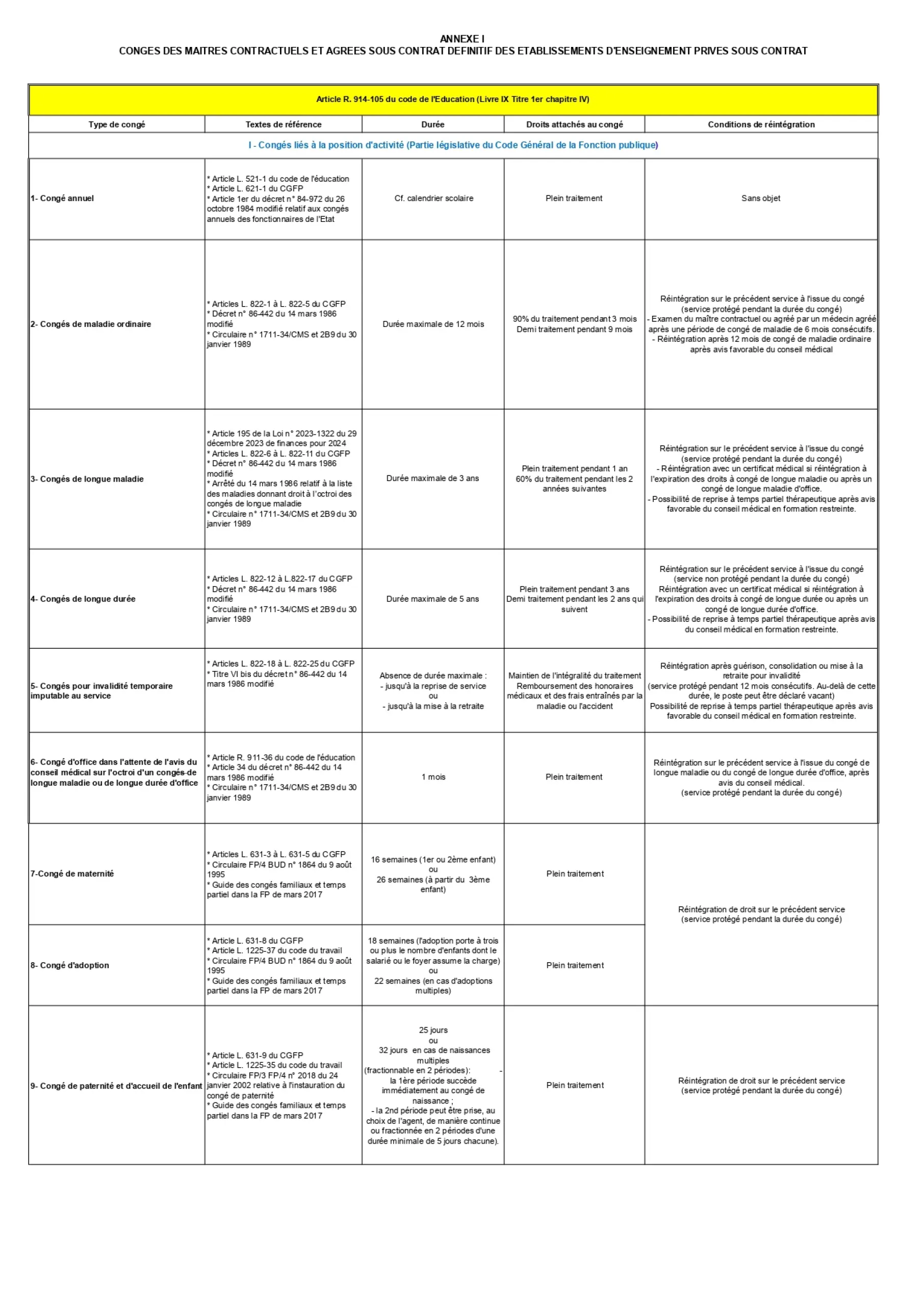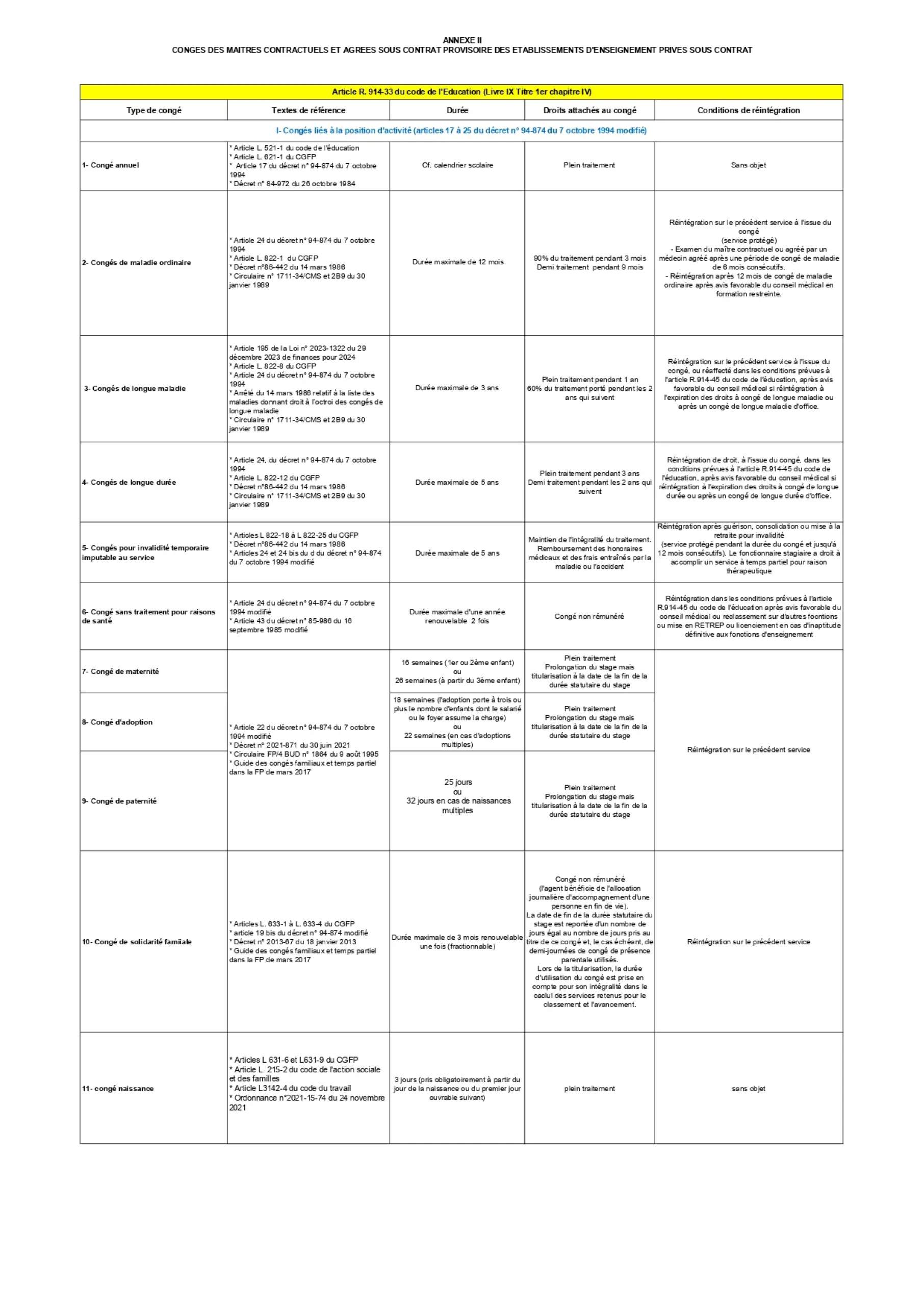 Les maîtres contractuels et agréés bénéficient des mêmes congés et disponibilités que les enseignants du public. Ceux dont le contrat ou l’agrément est définitif bénéficient des dispositions applicables aux fonctionnaires. Ceux qui ont un contrat ou un agrément provisoire bénéficient de celles applicables aux stagiaires de l’État.