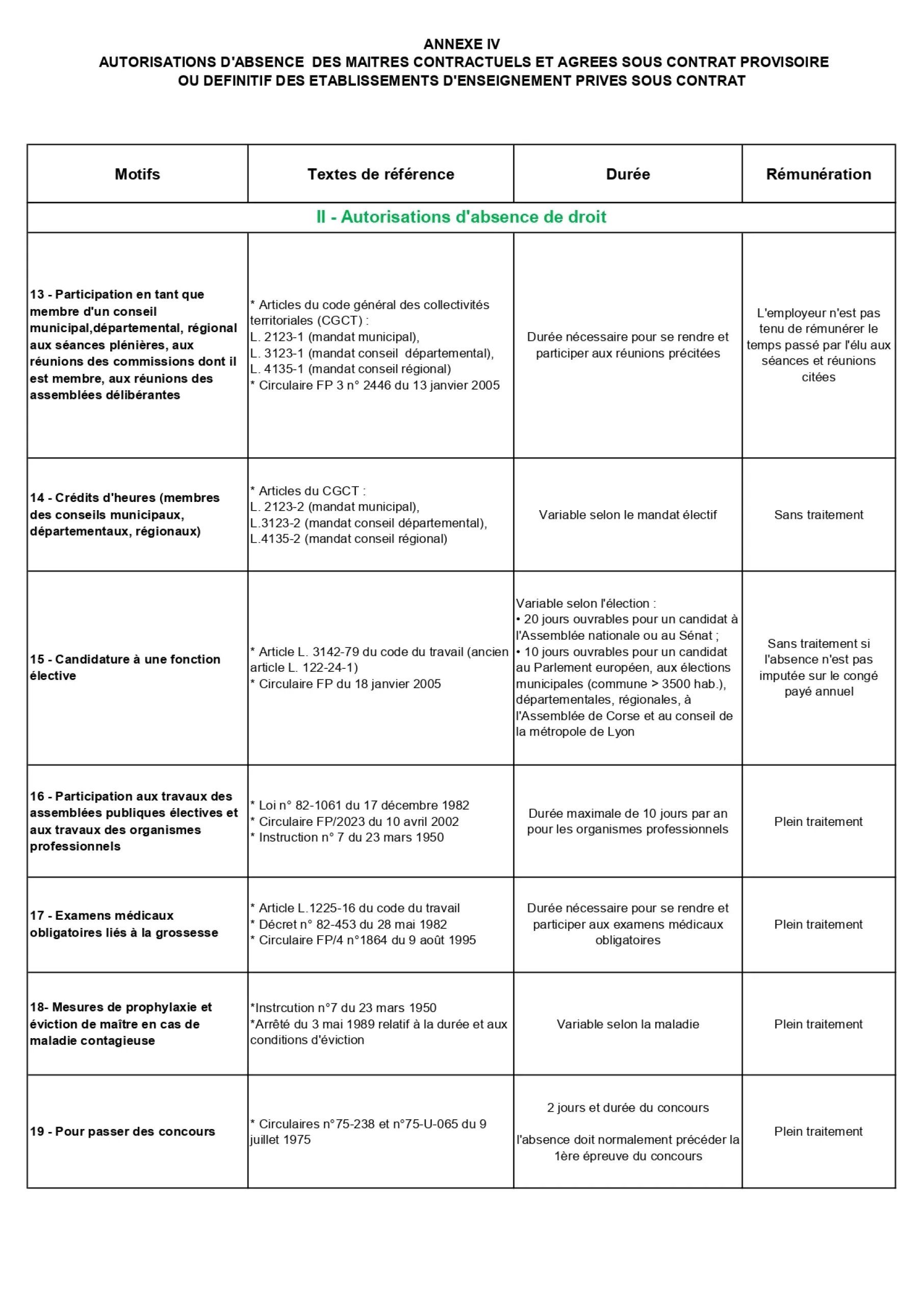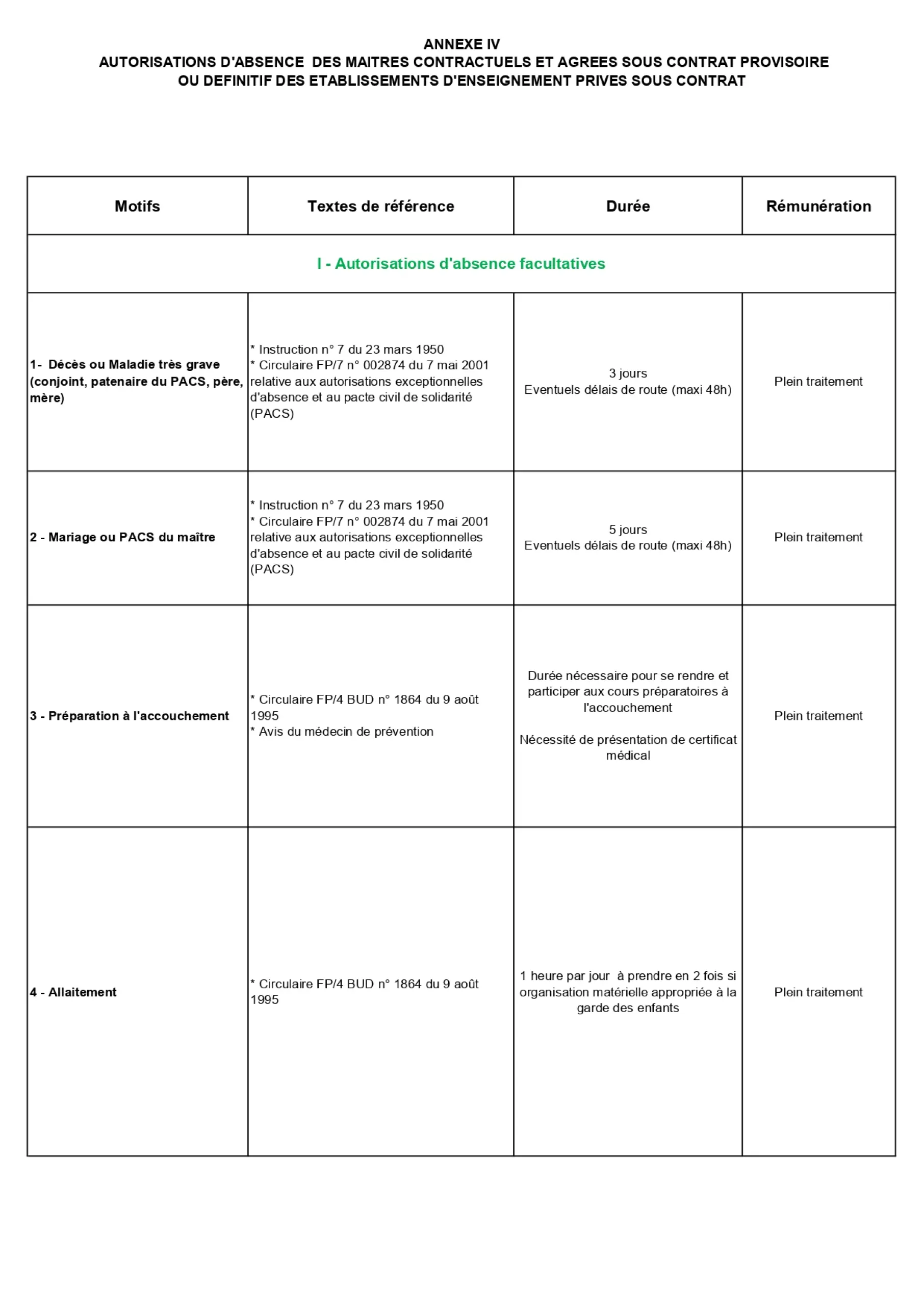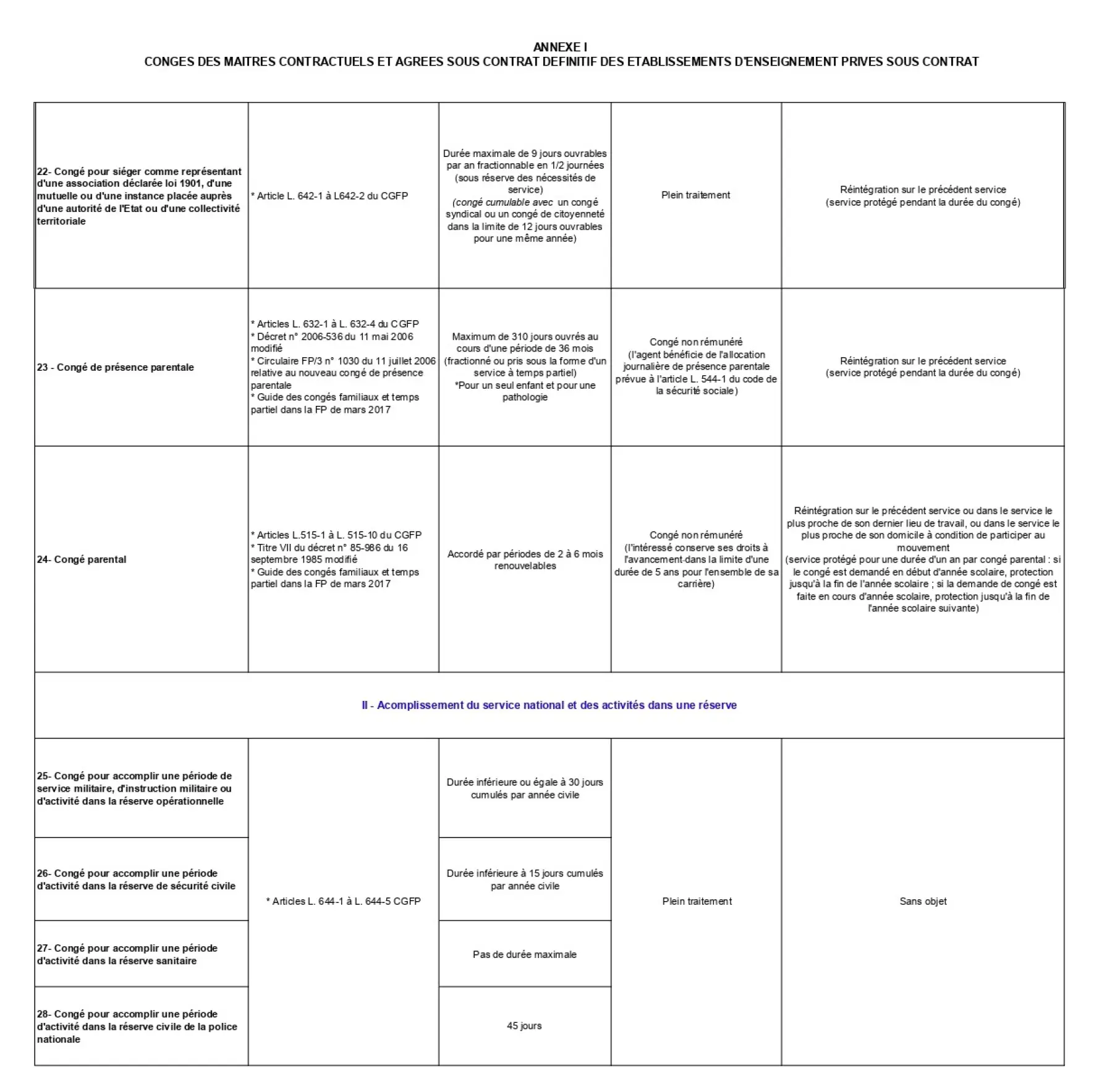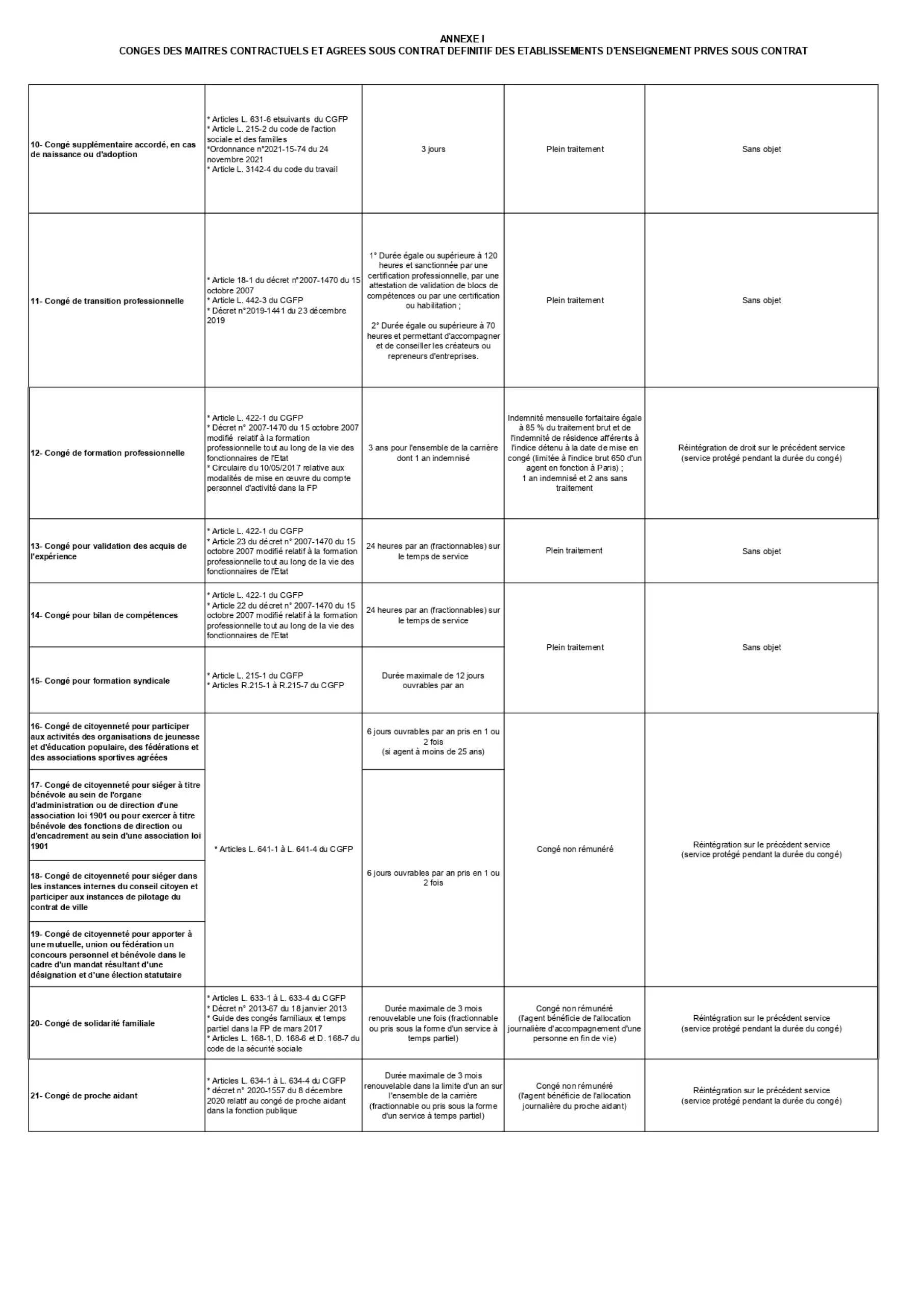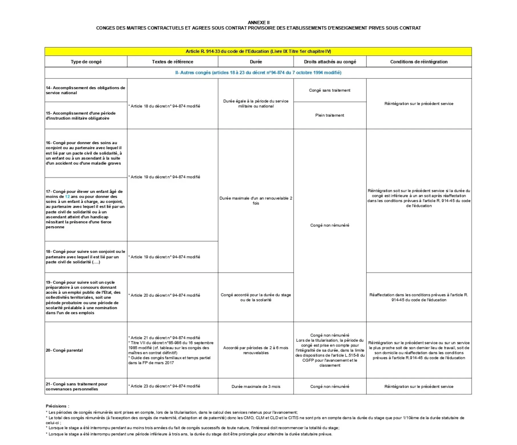 Les maîtres contractuels et agréés bénéficient des mêmes congés et disponibilités que les enseignants du public. Ceux dont le contrat ou l’agrément est définitif bénéficient des dispositions applicables aux fonctionnaires. Ceux qui ont un contrat ou un agrément provisoire bénéficient de celles applicables aux stagiaires de l’État.